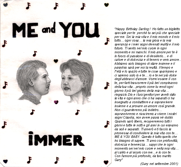 "Darling Wife. Banale ? No !! Davvero penso di no. Lo stesso destino per noi due, era scritto che dovevamo essere... ME & YOU. Come in una scena perfetta di un film, siamo un sogno divenuto realtà. Congiunti perfettamente per l'eternità... ME & YOU. Ogni giorno ho bisono di te sempre di più e anche ogni notte. Non ti lascerò mai andare e non l'ho mai voluto. ME AND YOU BABY. TI AMO. Gary" (Gary nel marzo 2001 )