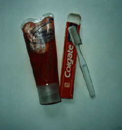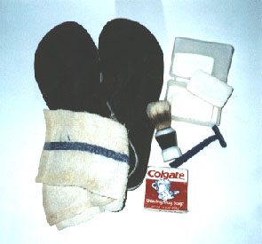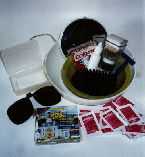 Gary's few personal items: soap, mirror, shaving things, brush, 2 bowls, anti-acid tablets, cotton swabs, sun glasses |