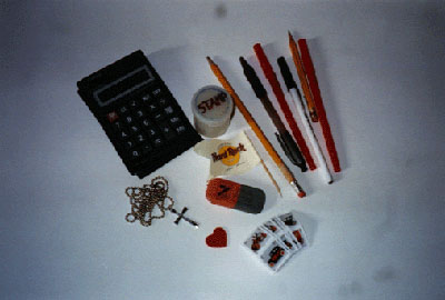 Pencils, pens, rubber, stamps, calculator, chain with a cross