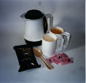 Coffee pot, coffee cups, sugar, spoons, coffee