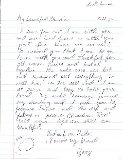 Three hourse before he was killed, Gary wrote his final letter to me from the death house. Father Walsh handed me the letter while I was waiting for Gary's phone call in the Hospitality House. When Gary finally called he apologized that the letter only was so short. Gary said that he actually wanted to write more, but he had no time. They kept him busy in the death house. Chaplains were praying with Gary, his lawyer was visiting with him, then he was served his last meal and finally he was able to make some phone calls.